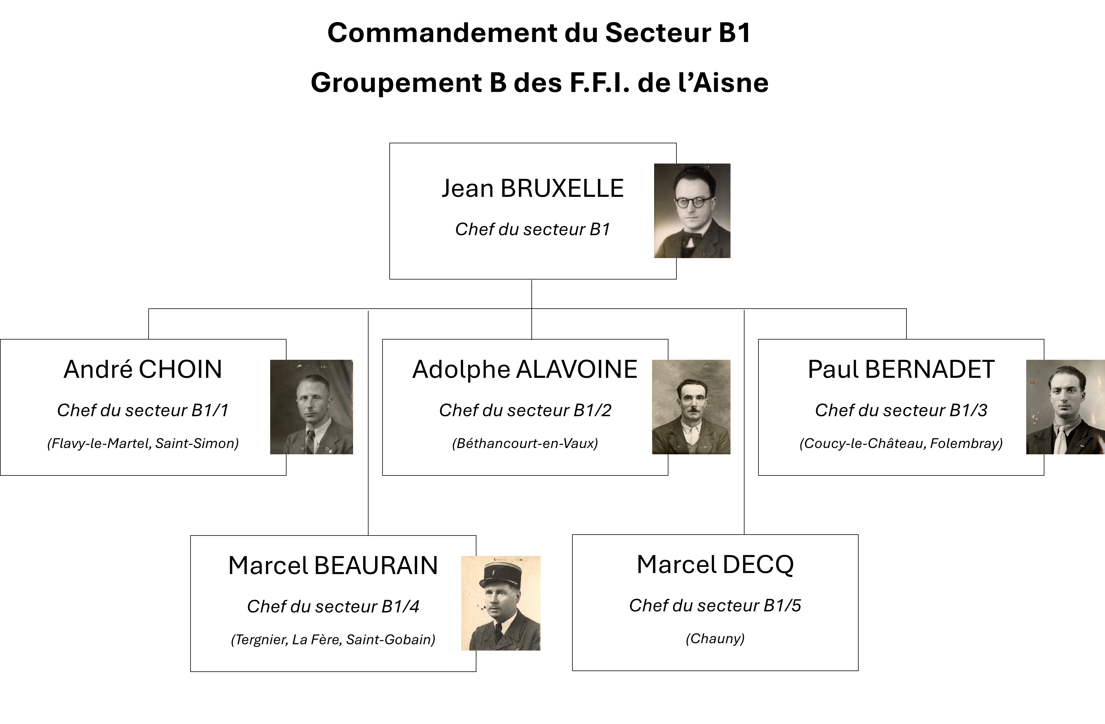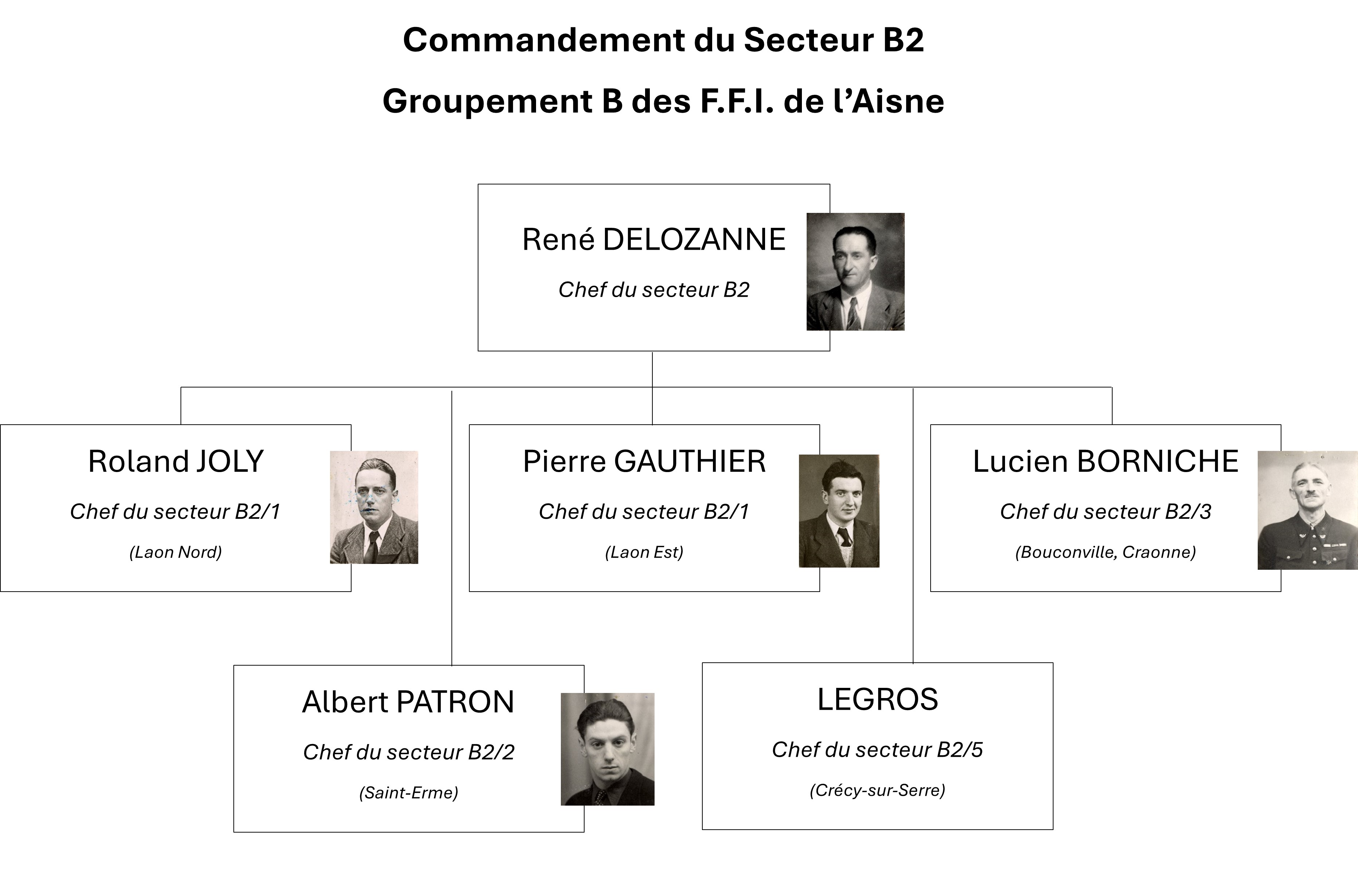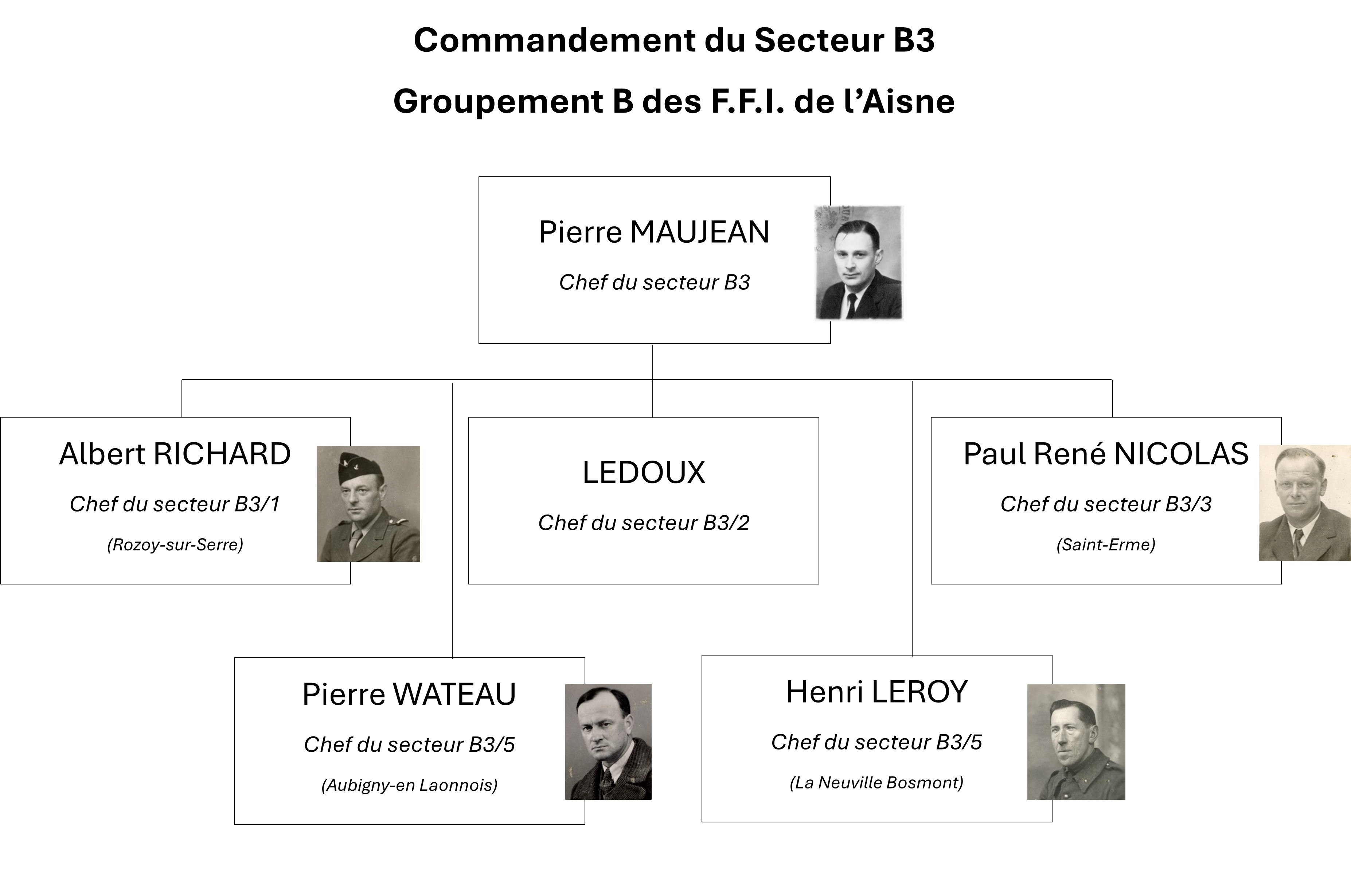 L’homme nommé à la tête du Groupement B est Etienne Dromas (1911-1995). Résistant A.S./O.C.M. d’Ugny-le-Gay, celui-ci avait formé à partir de 1942 plusieurs réseaux de résistance sous le pseudonyme de Camille puis de René, prenant une part active de grande ampleur dans le sauvetage d’aviateurs alliés tombés en zone occupée d’une part (réseau Pat O’Leary, Comète, Bourgogne puis Shelburn), et dans la collecte et le transfert de renseignements vers Londres d’autre part. Dans les semaines qui suivent, Etienne Dromas désigne lui-même ses chefs de secteurs, et tout le Groupement B se structure peu à peu dans tout l’arrondissement de Laon en trois secteurs nommés B1, B2 et B3, avec à leur tête Jean Bruxelle, René Delozanne et Pierre Maujean.